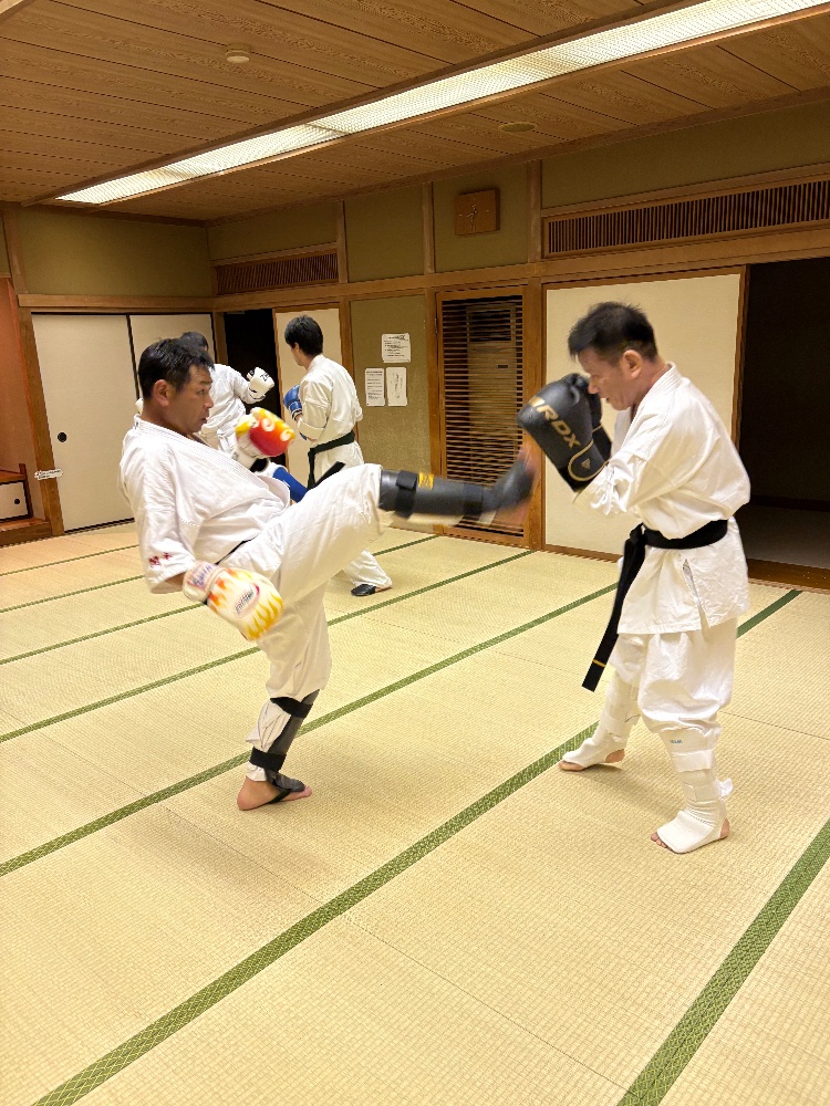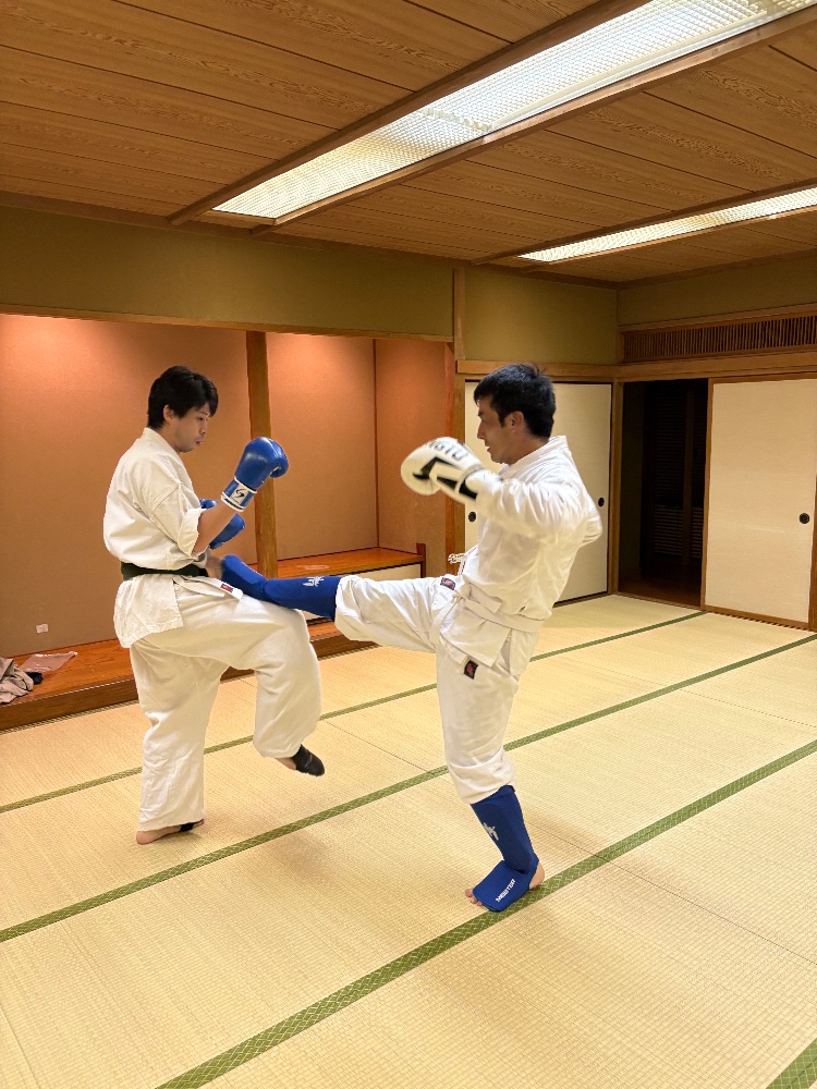 安全に防具を付けての攻撃や防御の練習と軽いスパーリングのタイミングの写真です